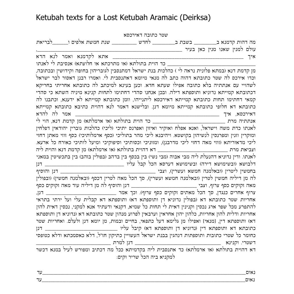The Ketubah, which literally means “that which is written,” was created and enacted during the period of the Mishna and Talmud, approximately 2,000 years ago. Though written with Hebrew letters, the original Ketubah was written in the Aramaic language, the language used by Jewish people during the Babylonian exile.